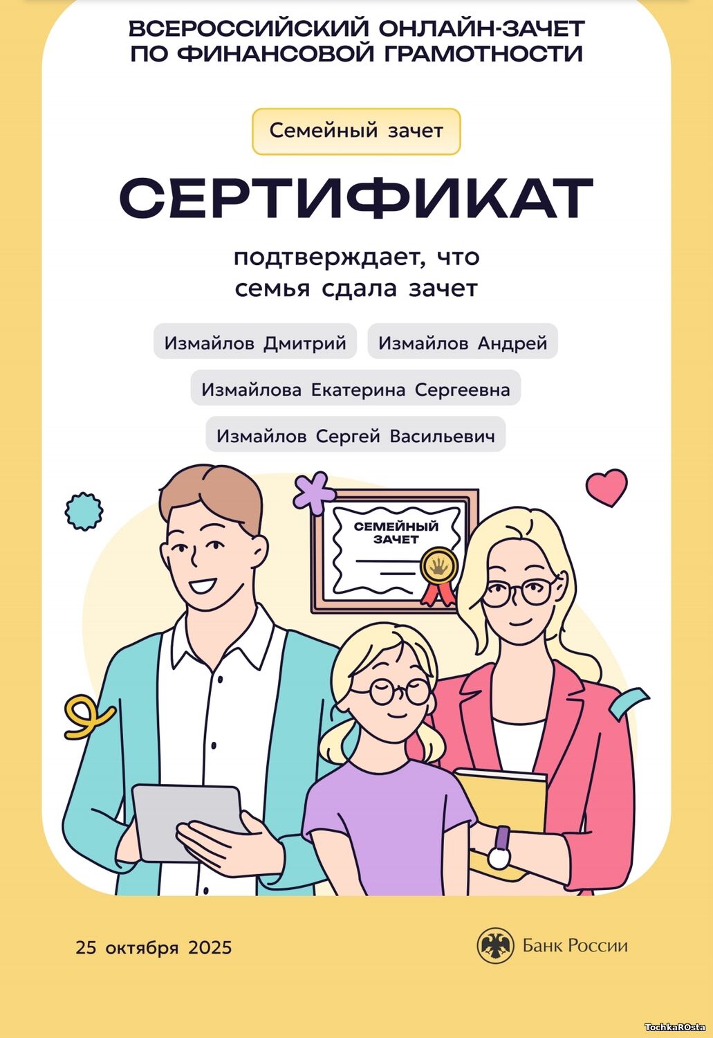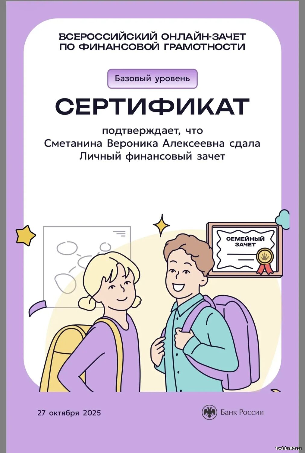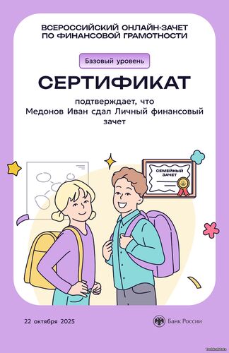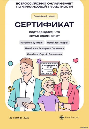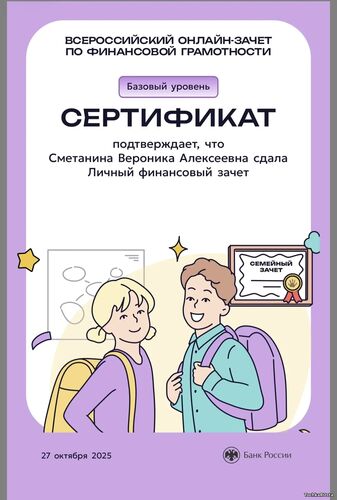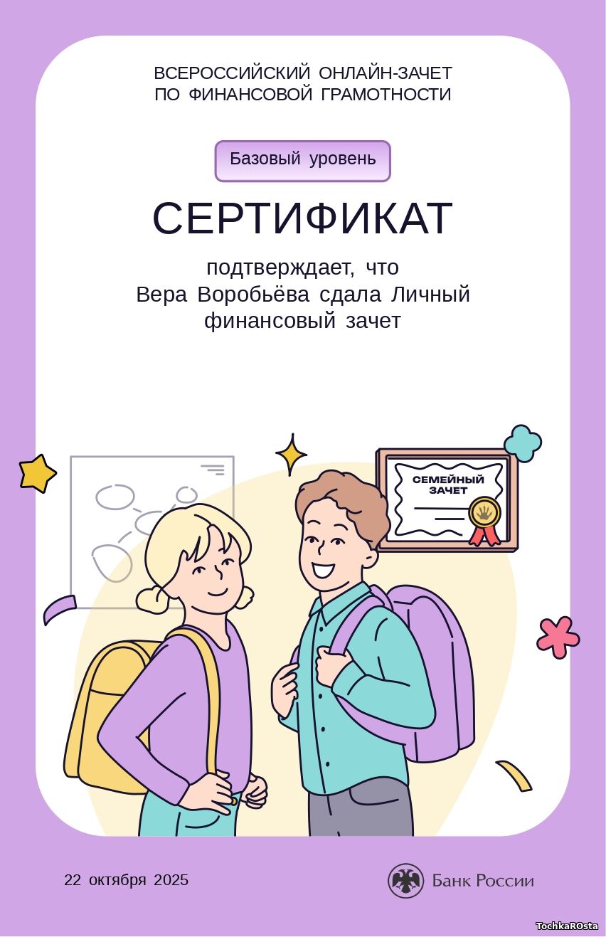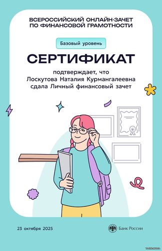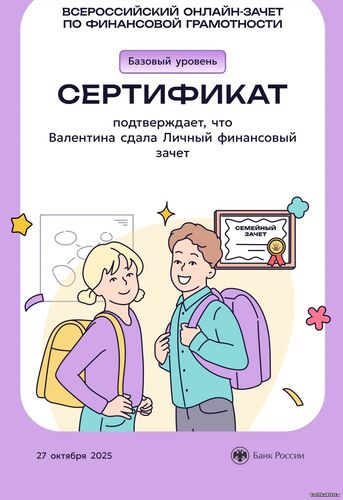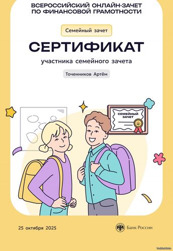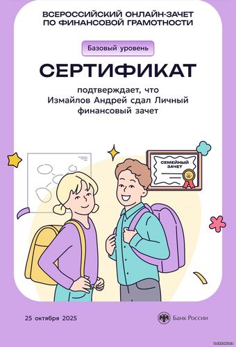 В период с 7 по 28 октября 2025 года проходил ежегодный просветительский проект Банка России, нацеленный на формирование финансовой культуры и популяризацию темы финансовой грамотности среди всех категорий населения. Зачет можно было пройти индивидуально или всей семьей. Задания подготовлены на основе конкретных жизненных ситуаций и помогают научиться принимать рациональные финансовые решения. Для тех, кто уже отлично ориентируется в финансовых вопросах, предусмотрен продвинутый уровень сложности. Финзачет – это возможность проверить свои знания, получить полезные рекомендации и собрать коллекцию достижений. Каждый участник, успешно завершивший зачет, получит именной сертификат. Ребята 3А класса: Измайлов Андрей, Амиров Тамерлан, Тупчик Анастасия, Сметанина Вероника, Воробьёва Вера, Кайгородова Валентина, Точенников Атём, Медонов Иван, Климова Юлия, Липова Елизавета, Охременко Владислав, а так же родители: Ляйхнер Маргарита Радиковна, семья Точенниковых, Климовых, Измайловых и классный руководитель Лоскутова Н.К. повысили свою финансовую грамотность! Молодцы! | |