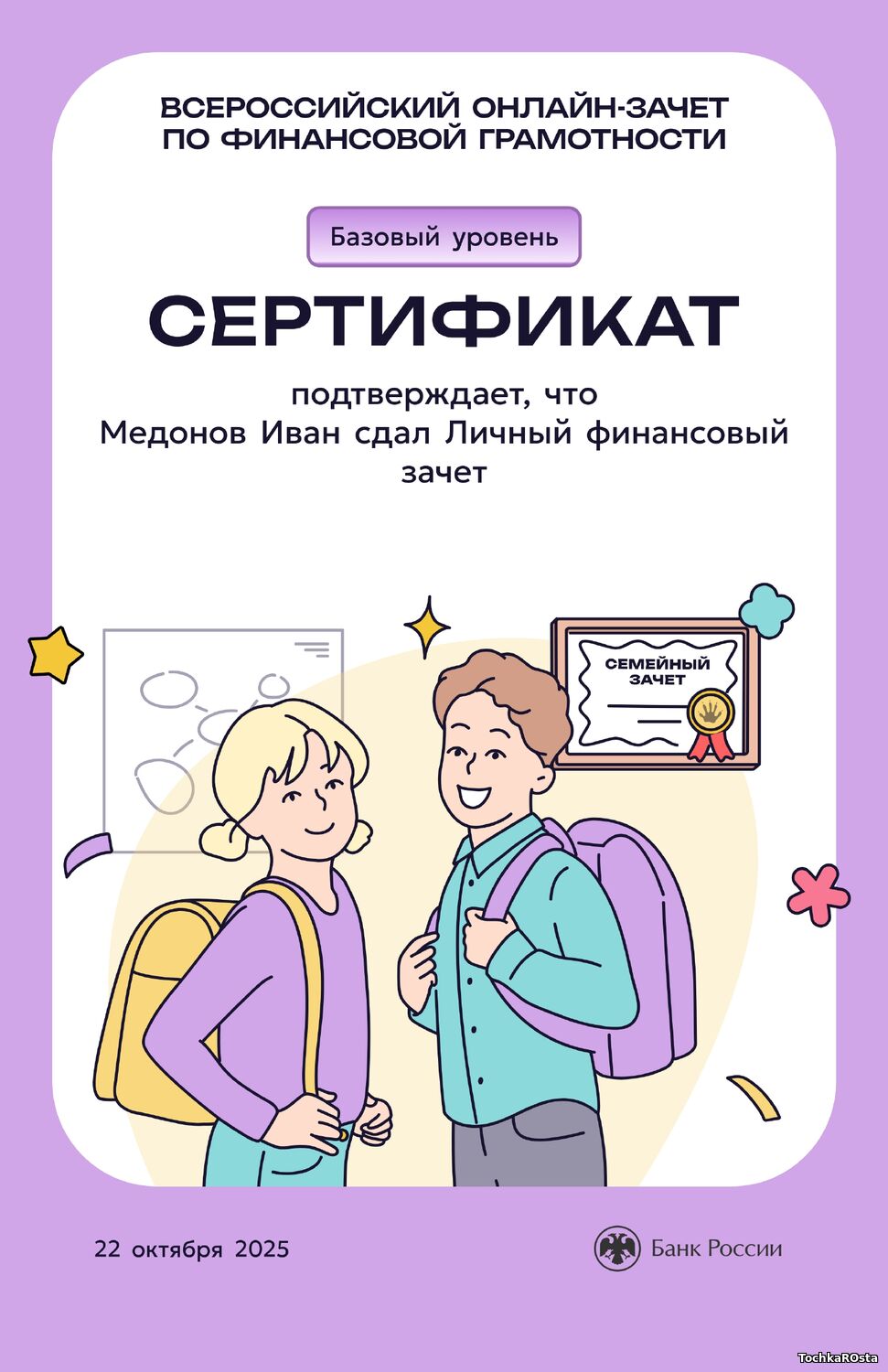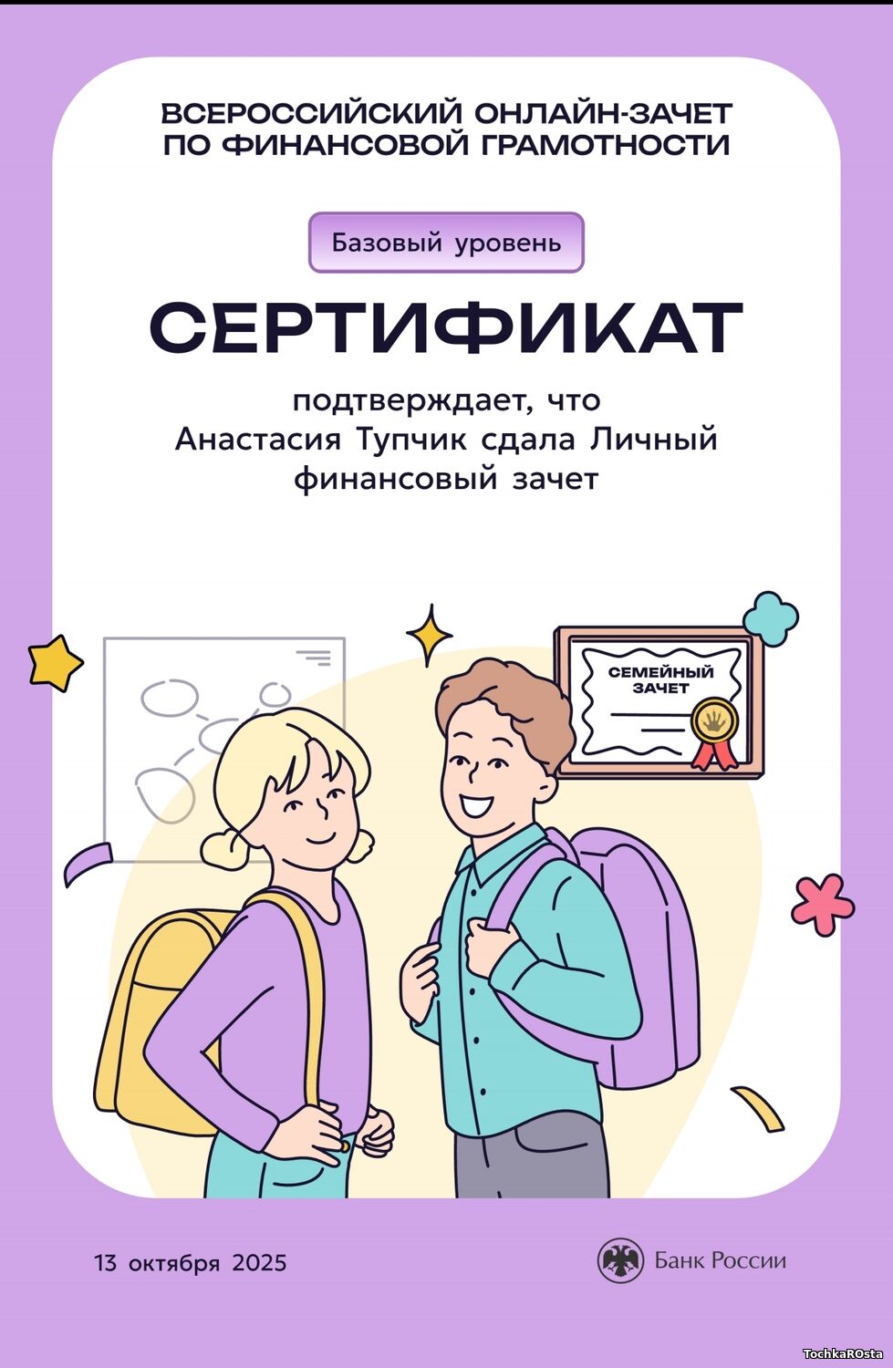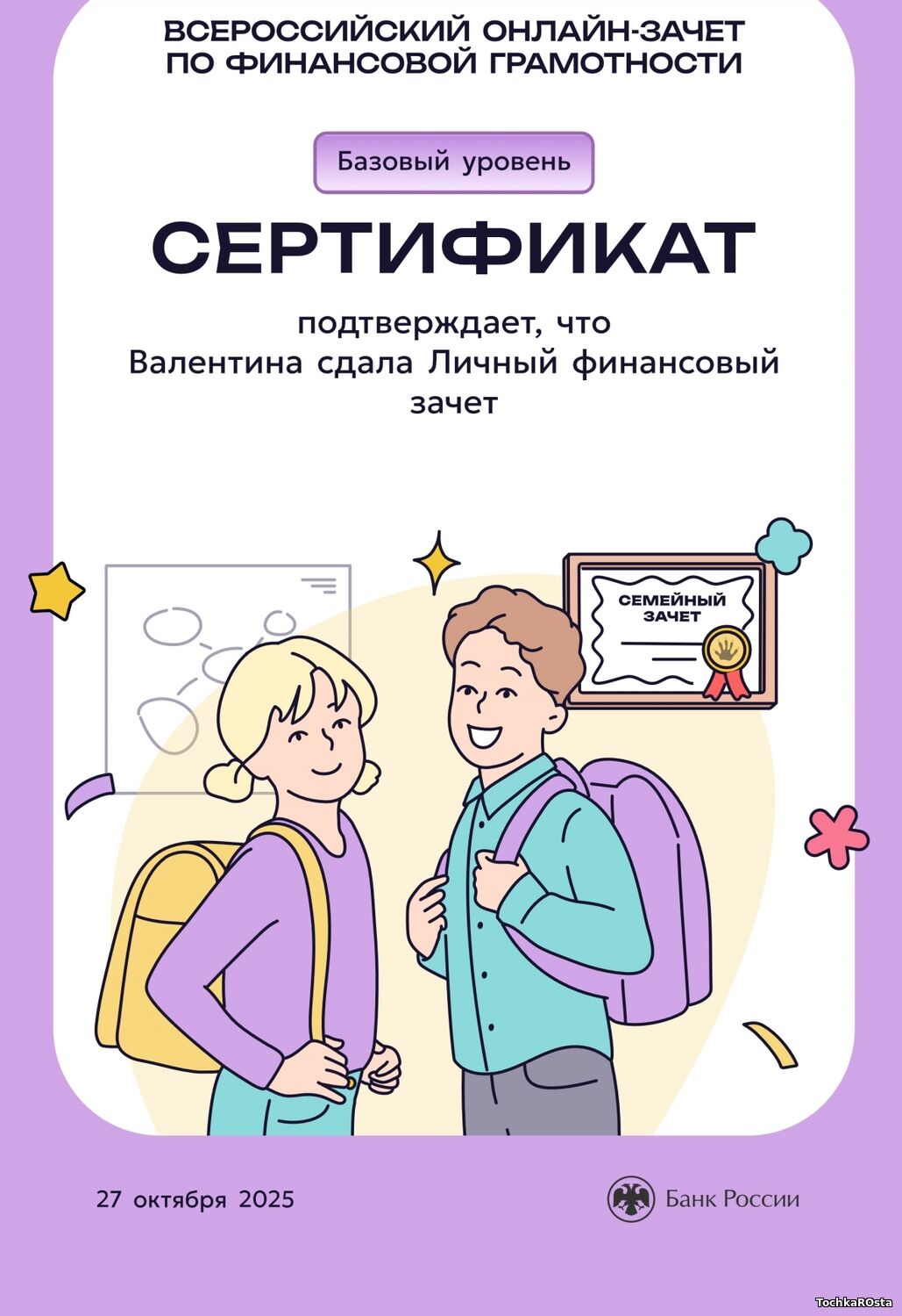 В период с 7 по 28 октября 2025 года проходил ежегодный просветительский проект Банка России, нацеленный на формирование финансовой культуры и популяризацию темы финансовой грамотности среди всех категорий населения. Зачет можно было пройти индивидуально или всей семьей. Задания подготовлены на основе конкретных жизненных ситуаций и помогают научиться принимать рациональные финансовые решения. Для тех, кто уже отлично ориентируется в финансовых вопросах, предусмотрен продвинутый уровень сложности. Финзачет – это возможность проверить свои знания, получить полезные рекомендации и собрать коллекцию достижений. Каждый участник, успешно завершивший зачет, получит именной сертификат. Ребята 3А класса: Измайлов Андрей, Амиров Тамерлан, Тупчик Анастасия, Сметанина Вероника, Воробьёва Вера, Кайгородова Валентина, Точенников Атём, Медонов Иван, Климова Юлия, Липова Елизавета, Охременко Владислав, а так же родители: Ляйхнер Маргарита Радиковна, семья Точенниковых, Климовых, Измайловых и классный руководитель Лоскутова Н.К. повысили свою финансовую грамотность! Молодцы! | |